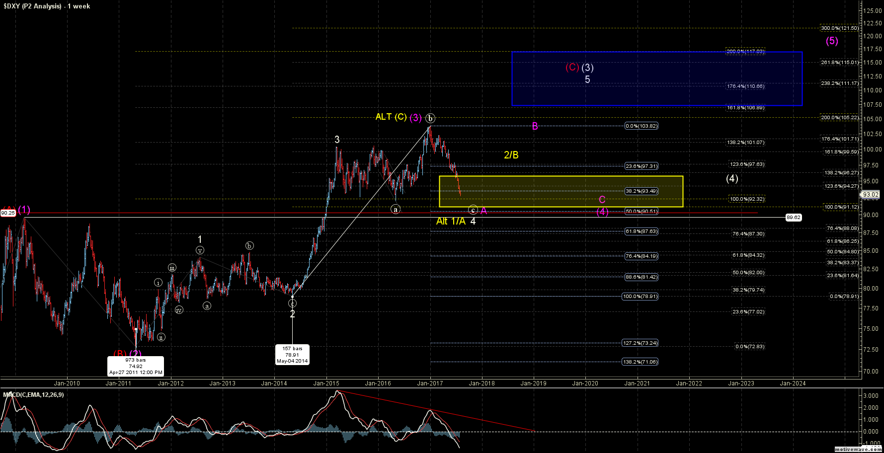 These shorter term support levels are also very close to the lower end of the long term support zone which comes in at the 91.12 level. A strong break of this 91.12 level would be the initial signal that this larger degree bullish pattern is breaking down. This would then open the door to the DXY seeing much lower levels over the course of the next several years.